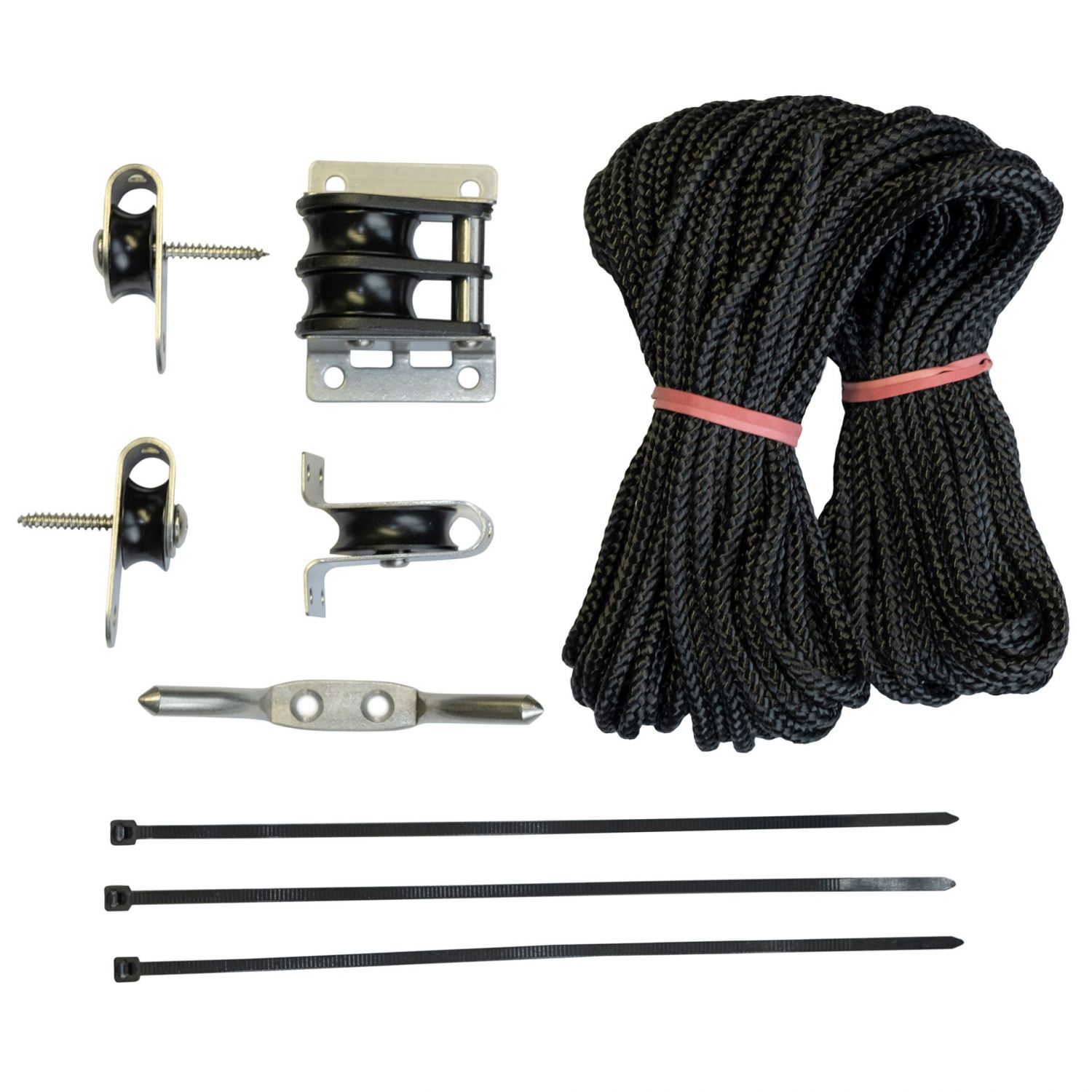 Inbegrepen bij het sluitsysteem: Dubbele katrol (2), enkele katrol, touw