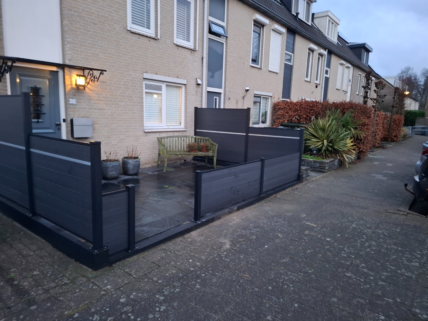 | Materiaal | Composiet van kunststof met houtvezels omhult met een beschermlaag van kunststof |