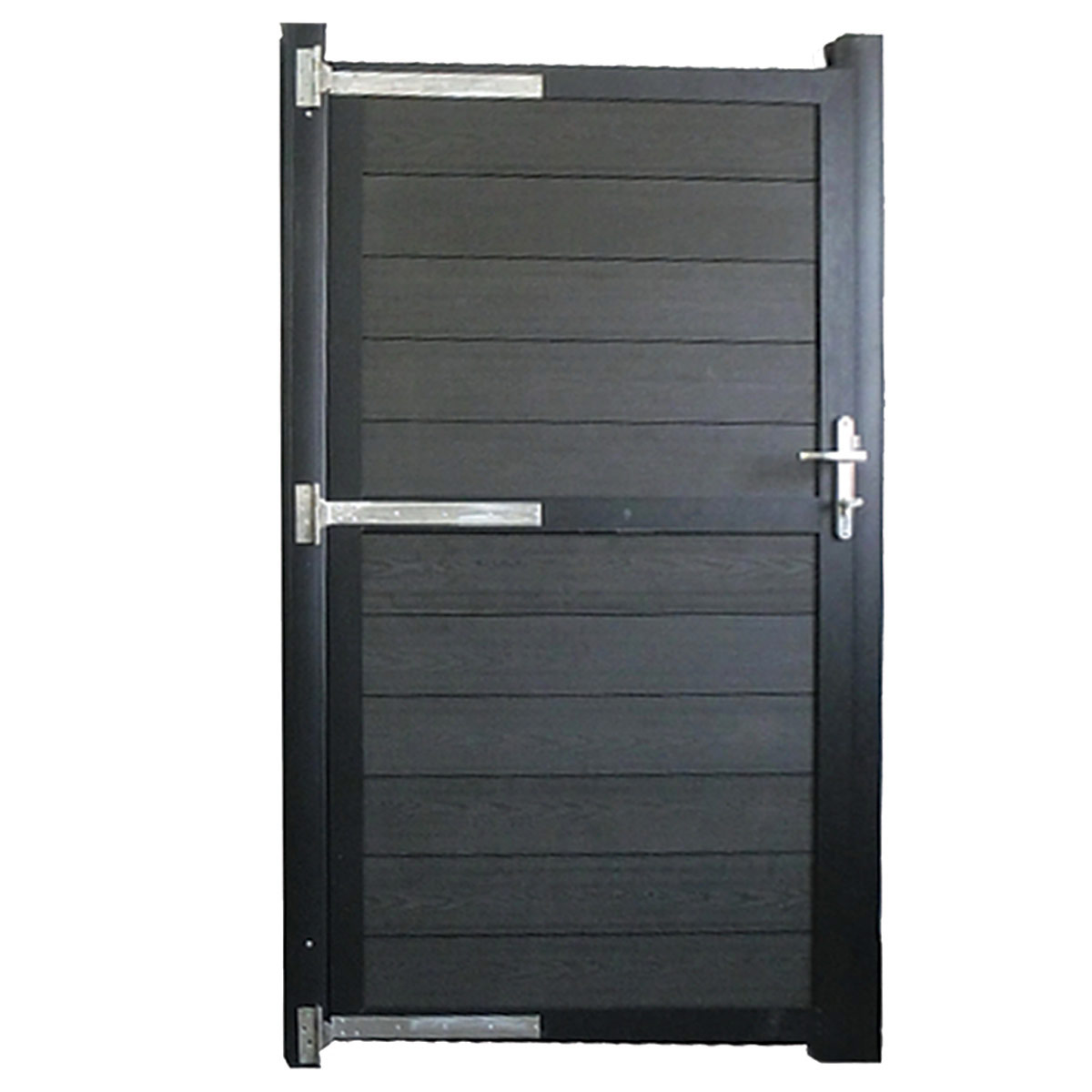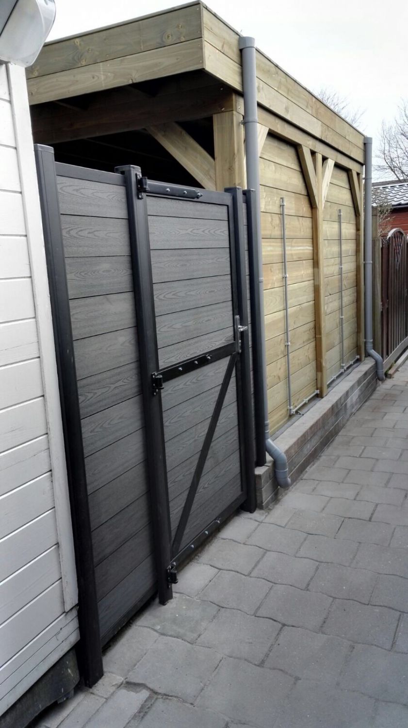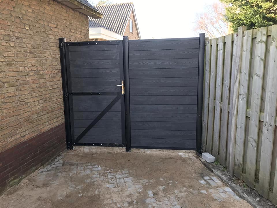 Met de Unique Composiet Schutting van Garden Enterprises maakt u in een handomdraai een luxe, strakke en vooral duurzame tuinafscheiding. Het systeem bestaat uit zwarte aluminium palen in combinatie met stapelbare composiet planken, een trellis of aluminium decoratielijsten. De planken zijn samengesteld uit een combinatie van FSC gecertificeerd hout(vezels) en gerecycled gecertificeerd HDPE kunststof. Dit composiet is duurzaam, water- en vochtbestendig en eenvoudig in onderhoud. De houtnerfstructuur zorgt voor een natuurlijke uitstraling. Let op! De deur heeft aan één zijde een schuine schoor in het onderste deel van de deur.