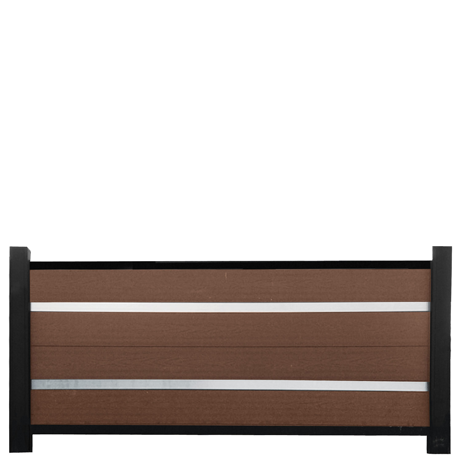 Dit type tuinhek bestaat uit 4 hout/kunststof composiet planken, 1 aluminium afdeklijst, 1 aluminium onderligger, 2 aluminium decolijsten, en wordt geleverd exclusief palen en L-steunen.