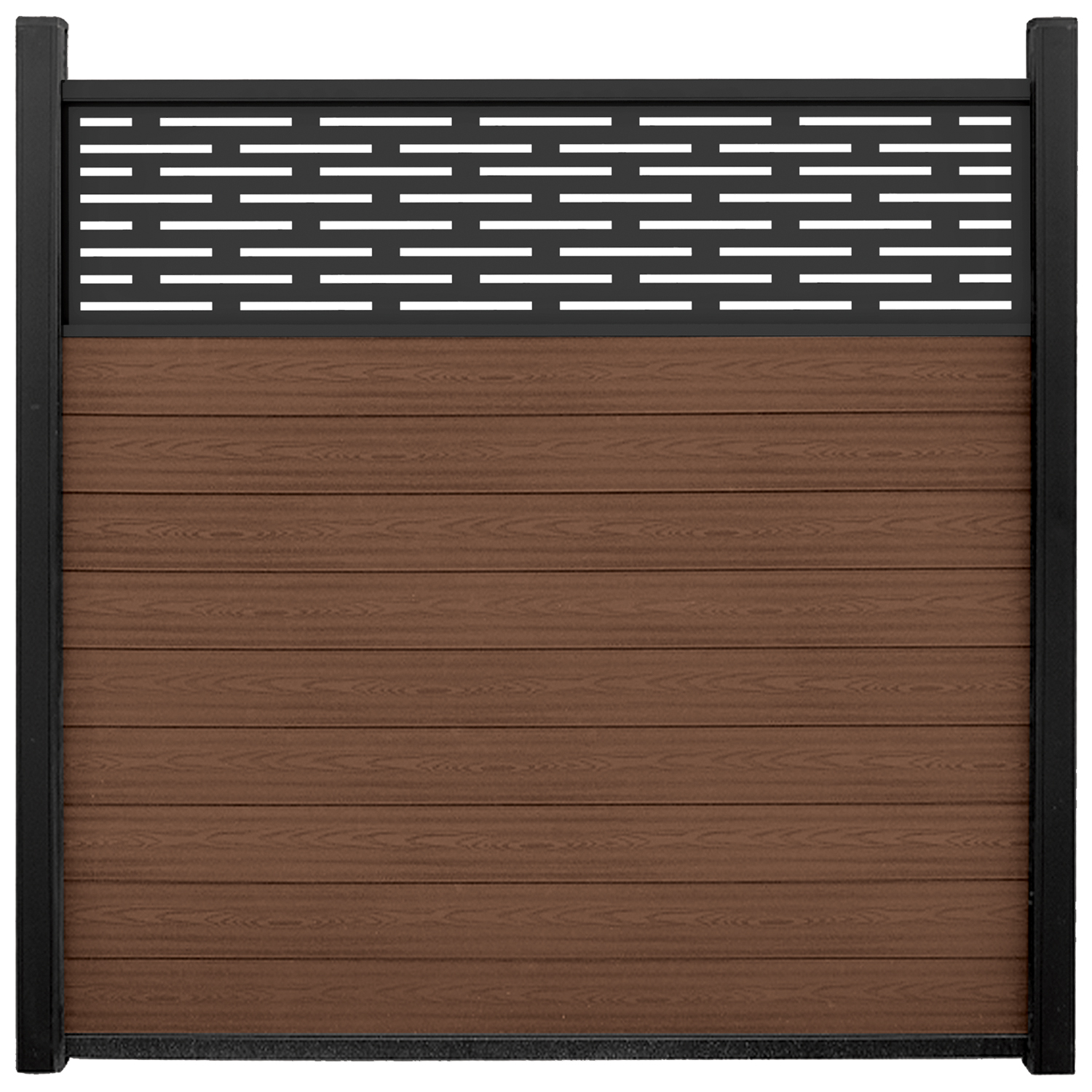 Dit type tuinscherm bestaat uit 10 hout/kunststof composiet planken, 2 aluminium afdeklijsten, 1 aluminium onderligger, 1 aluminium trellis en wordt geleverd exclusief palen en L-steunen.