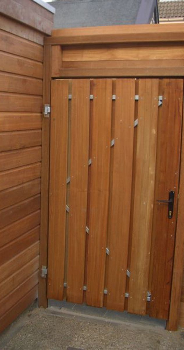 Een hardhouten tuindeur op stalen frame. Hardhout heeft zeer gunstige eigenschappen voor een lange levensduur. Denk hierbij aan splijtweerstand, buigsterkte, splijtvastheid en duurzaamheid. Hiermee is hardhout bij uitstek geschikt voor buitentoepassingen. Een hardhouten tuindeur gaat langer mee dan andere houtsoorten, zoals Grenen, Vuren en Douglas. Het hout is warm en egaal van kleur. Ook is hardhout goed bestand tegen eventuele aantasting door zuren en chemicalien. De hoge houtduurzaamheid van deze tuindeur is een van de belangrijkste kenmerken. De poort kan onbehandeld worden geplaatst. Let er wel op dat deze dan na verloop van tijd vergrijzen. Wil je de natuurlijke bruine kleur behouden dan kan je de schermen jaarlijks behandelen met bangkirai olie.