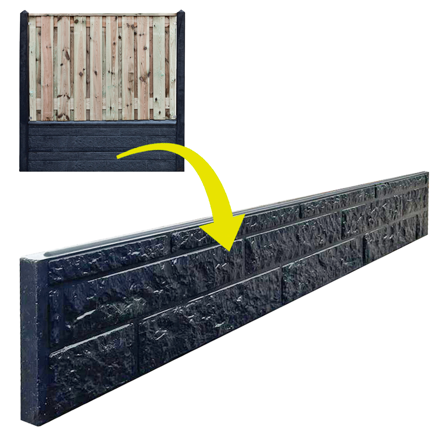 Een Luxe Hout & beton rotsmotief schutting is een combinatie van betonpalen, twee rotsmotief onderplaten met een betonnen afdekkap met daarop een plankenscherm van 130 cm hoog. De totale hoogte is ongeveer 195 cm. Een hout & beton rotsmotief schutting is de ideale combinatie voor een lange levensduur. Indien u de antraciet gekleurde beton elementen op kleur wilt houden dan kunt u de elementen behandelen met een speciale coating.