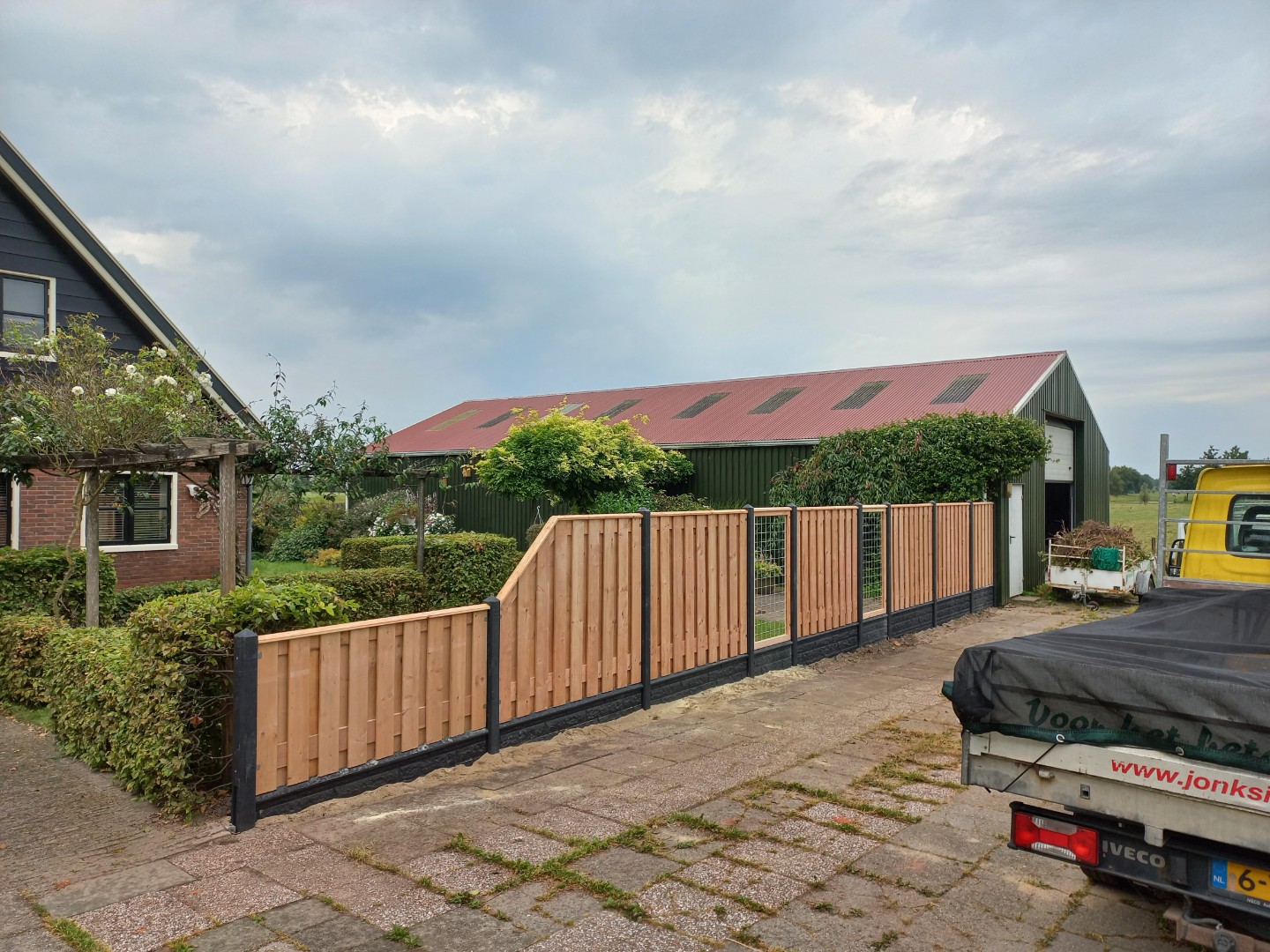 Een luxe hout- & beton rotsmotiefschutting is een combinatie van betonpalen, twee rotsmotief onderplaten met een betonnen afdekkap met daarop een plankenscherm van 130 cm hoog. De totale hoogte is ongeveer 195 cm. Een hout- & beton rotsmotiefschutting is de ideale combinatie voor een lange levensduur. Indien je de antraciet gekleurde betonelementen op kleur wilt houden dan kun je de elementen behandelen met een speciale coating.