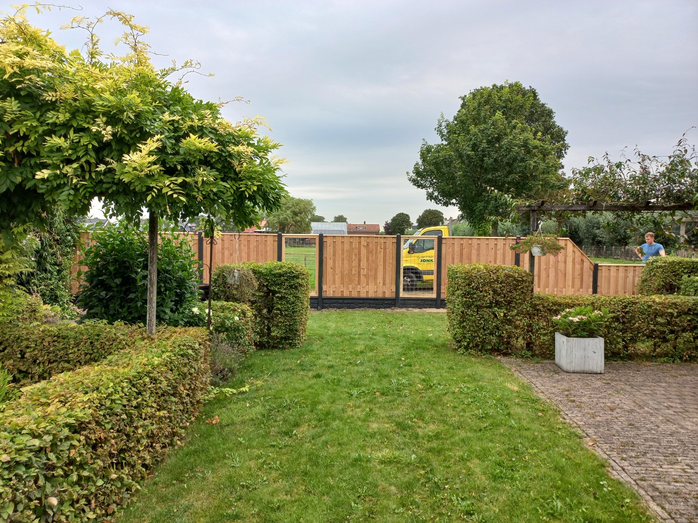 Let op! Een betonpaal wordt geproduceerd met twee gaten. Deze gaten zijn bedoeld voor het unibeslag waarbij de L-beugels aan elkaar verbonden worden d.m.v. een stuk tapeind die door de gaten in de palen gaan. Deze gaten zitten op een bepaalde hoogte die overeenkomen met een horizontale ligger van een 21-planks scherm of een douglas scherm. Bij alle overige schermen komen de horizontale liggers niet overeen met het voorgeboorde gat. Er zal dus een extra gat geboord moeten worden in de paal of je bevestigt het uni-beslag met kleinere schroeven alleen aan de plank.