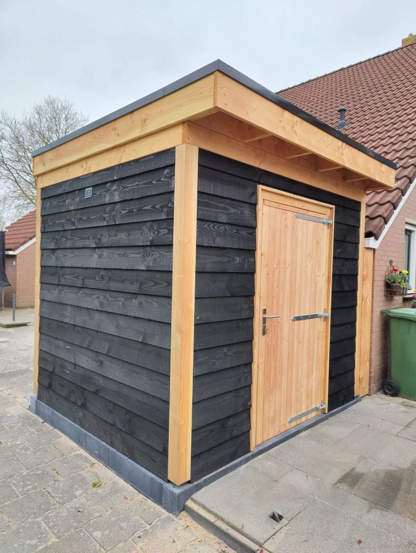 De zwarte Zweeds rabatplanken zorgen voor een strakke en moderne look, terwijl ze ook bijdragen aan de stevigheid en isolerende eigenschappen van de schuur. Deze planken overlappen elkaar, wat niet alleen een mooie uitstraling geeft, maar ook extra bescherming biedt tegen regen en wind.