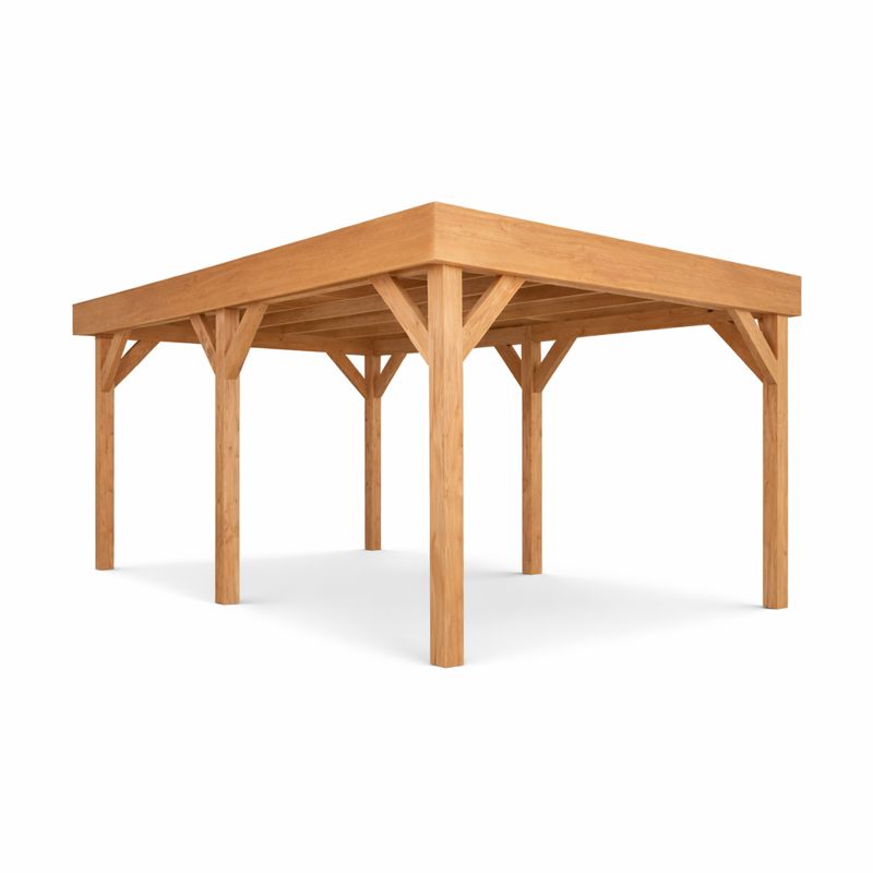 Het doe het zelf pakket wordt compleet geleverd inclusief dakbedekking, stadsuitloop, bevestigingsmaterialen etc. Wil je exact weten waar het pakket uit bestaat? Scroll dan naar beneden voor de complete materialenlijst. Optioneel kunnen de 12x12x300 cm palen tegen meerprijs worden vervangen voor 15x15x300 cm (bij een fijnbezaagd model) of 14x14x300 cm (bij een geschaafd model).