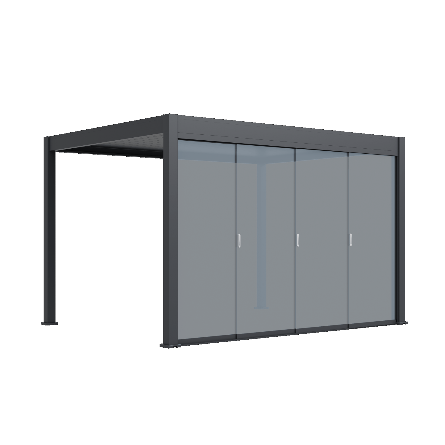 De profielvrije glaswanden van Orion geven je Orion overkapping een luxe en open uitstraling, zonder dat het zicht wordt verstoord door profielen of kaders. Deze glaswand is geschikt voor de 4 meter zijde van je Orion overkapping. Dankzij het slanke, naadloze ontwerp geniet je van een onbelemmerd uitzicht, terwijl je toch beschut zit tegen wind en regen. De glazen panelen schuiven soepel open en dicht, waardoor je eenvoudig bepaalt hoeveel beschutting of openheid je wilt. Zo creëer je een elegante en flexibele afsluiting die perfect past bij elke tuin of terras.