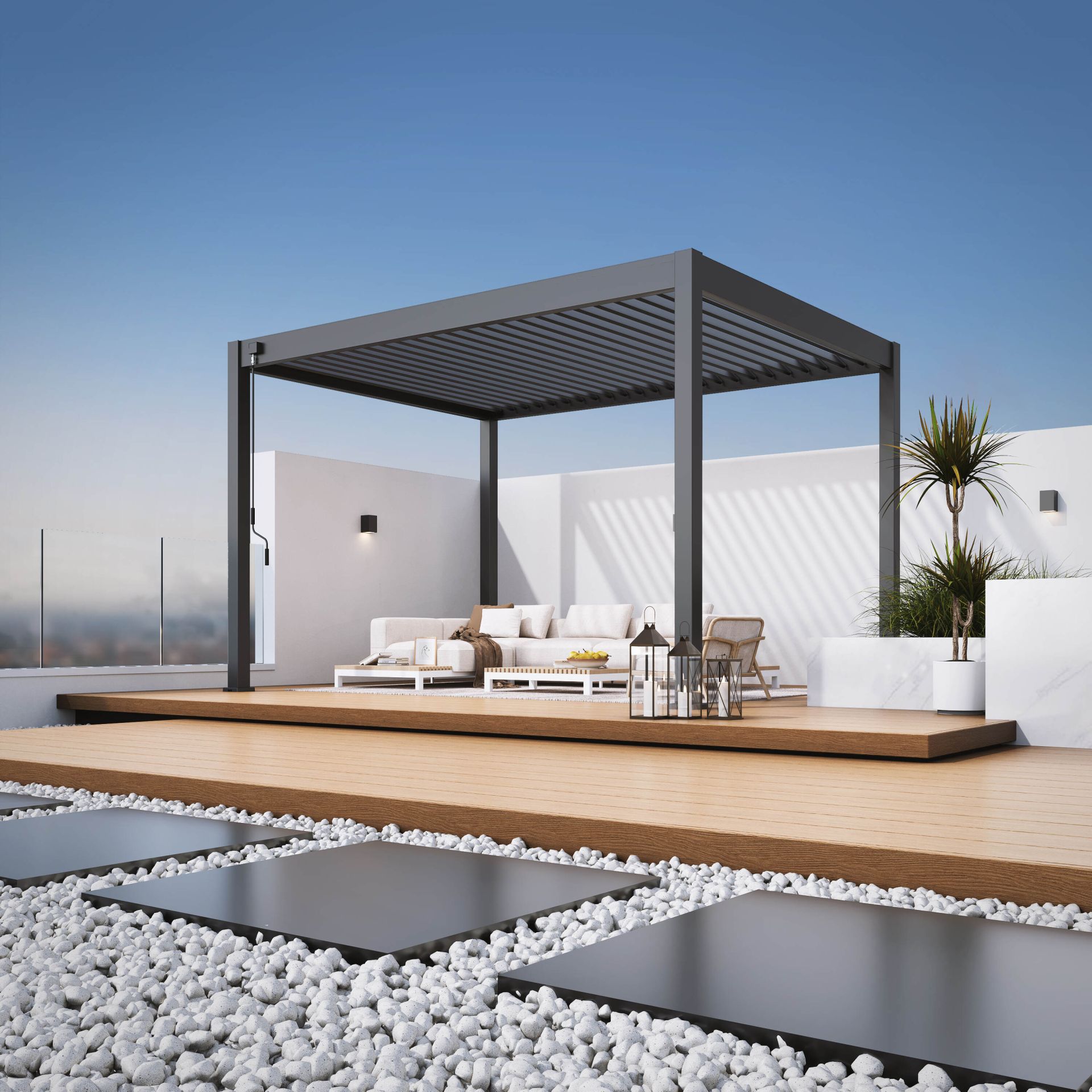 Je Orion Deluxe overkapping uitbreiden met accessoires? Dat kan! Met het Pull Down Zijscherm of het Louvre Shutter paneel zit je heerlijk in de schaduw en beschut tegen de wind. Daarnaast zorgen deze accessoires ook voor meer privacy. Door het unieke ontwerp bevestig je het zijscherm en het paneel volledig geïntegreerd in jouw pergola.