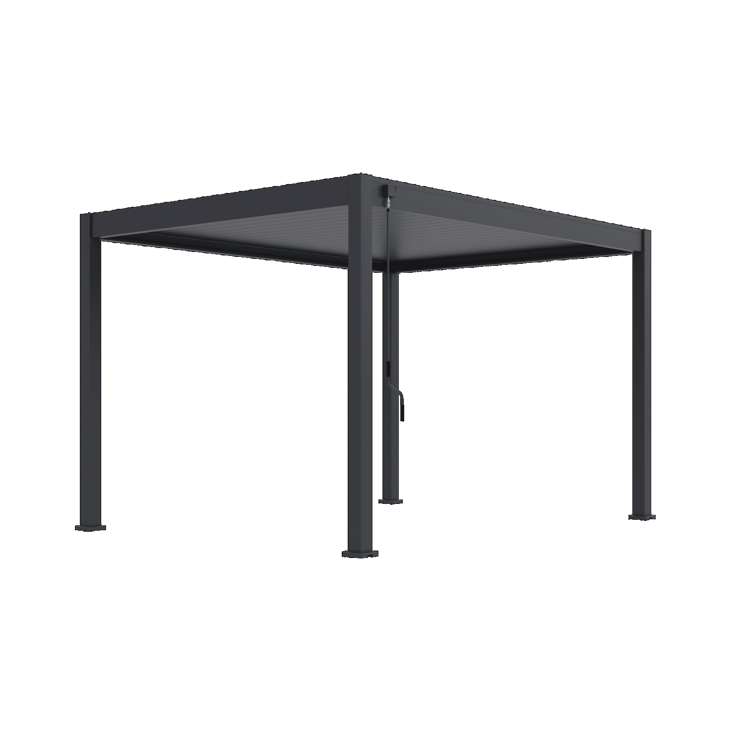 - Lamellendak: Het dak bestaat uit kantelbare aluminium lamellen. Je kunt deze openen om te genieten van zonlicht of sluiten voor schaduw en bescherming tegen regen. De lamellen kunnen 135 graden kantelen.