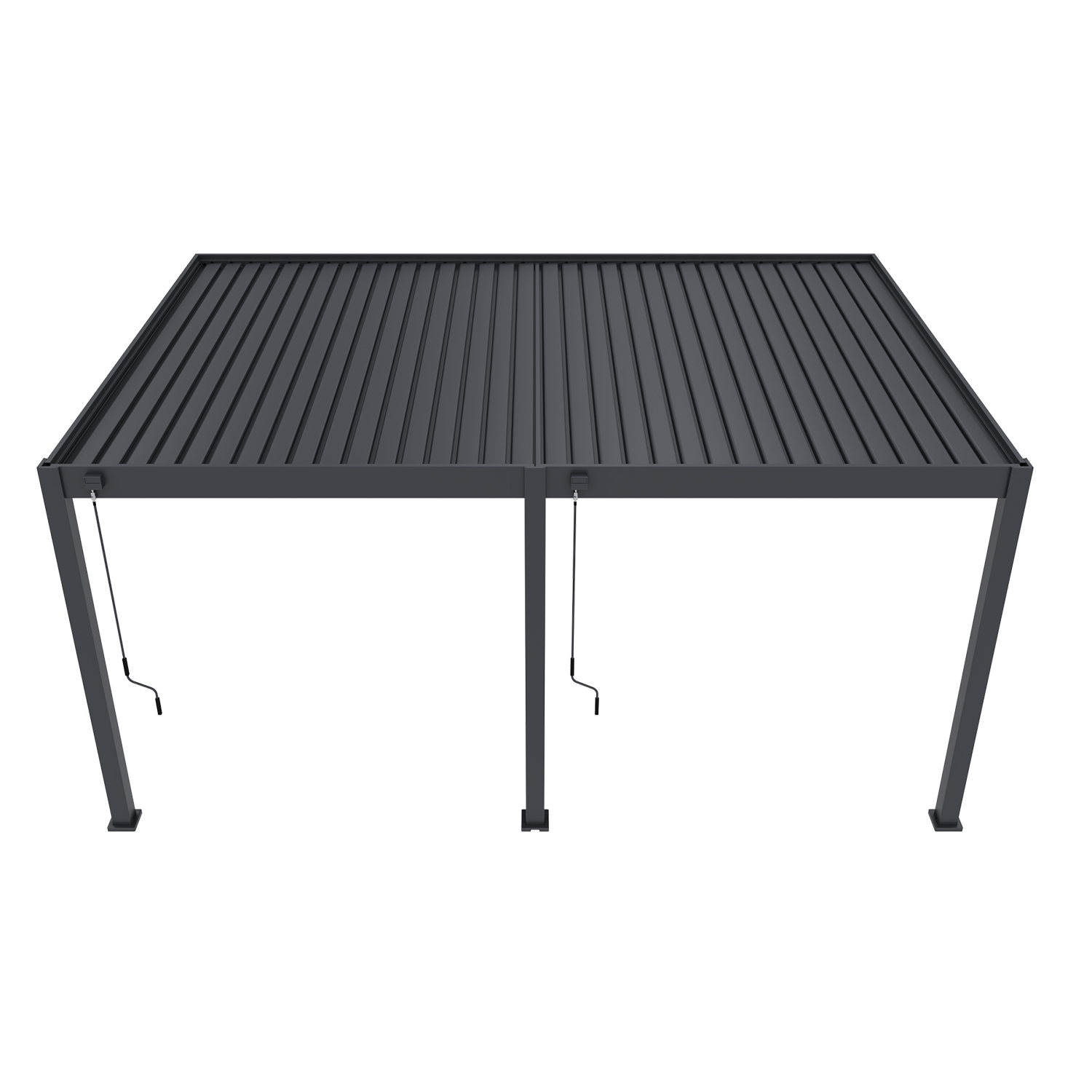 - Lamellendak: Het dak bestaat uit kantelbare aluminium lamellen. Je kunt deze openen om te genieten van zonlicht of sluiten voor schaduw en bescherming tegen regen. De lamellen kunnen 135 graden kantelen.