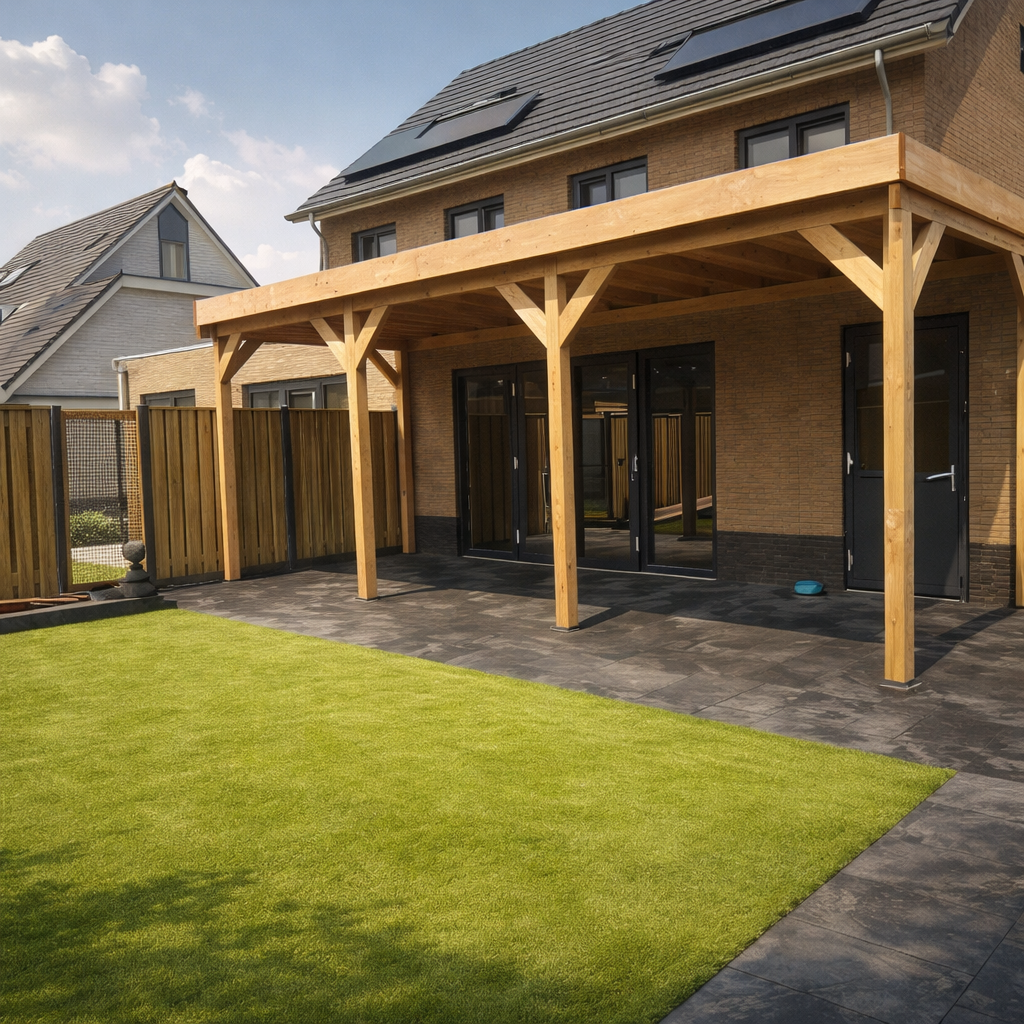 Het doe het zelf pakket wordt compleet geleverd inclusief dakbedekking, stadsuitloop, bevestigingsmaterialen etc. Wil je exact weten waar het pakket uit bestaat? Scroll dan naar beneden voor de complete materialenlijst. Optioneel kunnen de 12x12x300 cm palen tegen meerprijs worden vervangen voor 15x15x300 cm (bij een fijnbezaagd model) of 14x14x300 cm (bij een geschaafd model).
